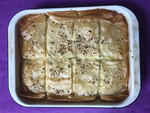 Lay down another 7 layers of Filo, each sprayed with oil. Give the top a final spritz, flick with water and sprinkle Sesame Seeds on top.