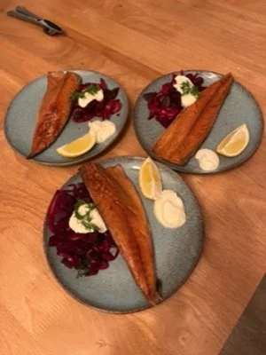 Smoked Mackerel with Beetroot & Red Onion Salad followed by ..