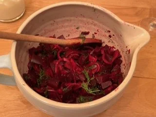 Drain the beetroots, then rub the skins off while still hot using clean rubber gloves. Dice into bite size cubes then toss with the pickled onions, crushed seeds and herbs, 2tbsp oil and the remaining zest of ½ lemon. Add the grated horseradish to the crème fraîche