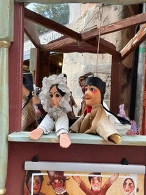 He first popped up (as it were) in the 19th Century here. He came about via a popular figure in Lyon called Gnafron. According to local tales he was 'a bit of a buffoon, a bit clumsy, but always benevolent.' I like him already. Is he a little like our own Punch but less angry?