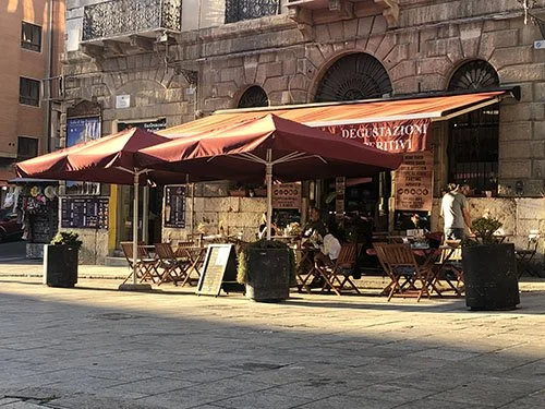 AMM: We discovered a nice place (La Cambusa) to drink an Aperol Spritz before our evening trip to the posh but very reasonable supermarket. The prices were astonishingly refreshing to see. Very decently priced cheeses, cold meats, breads & wines.